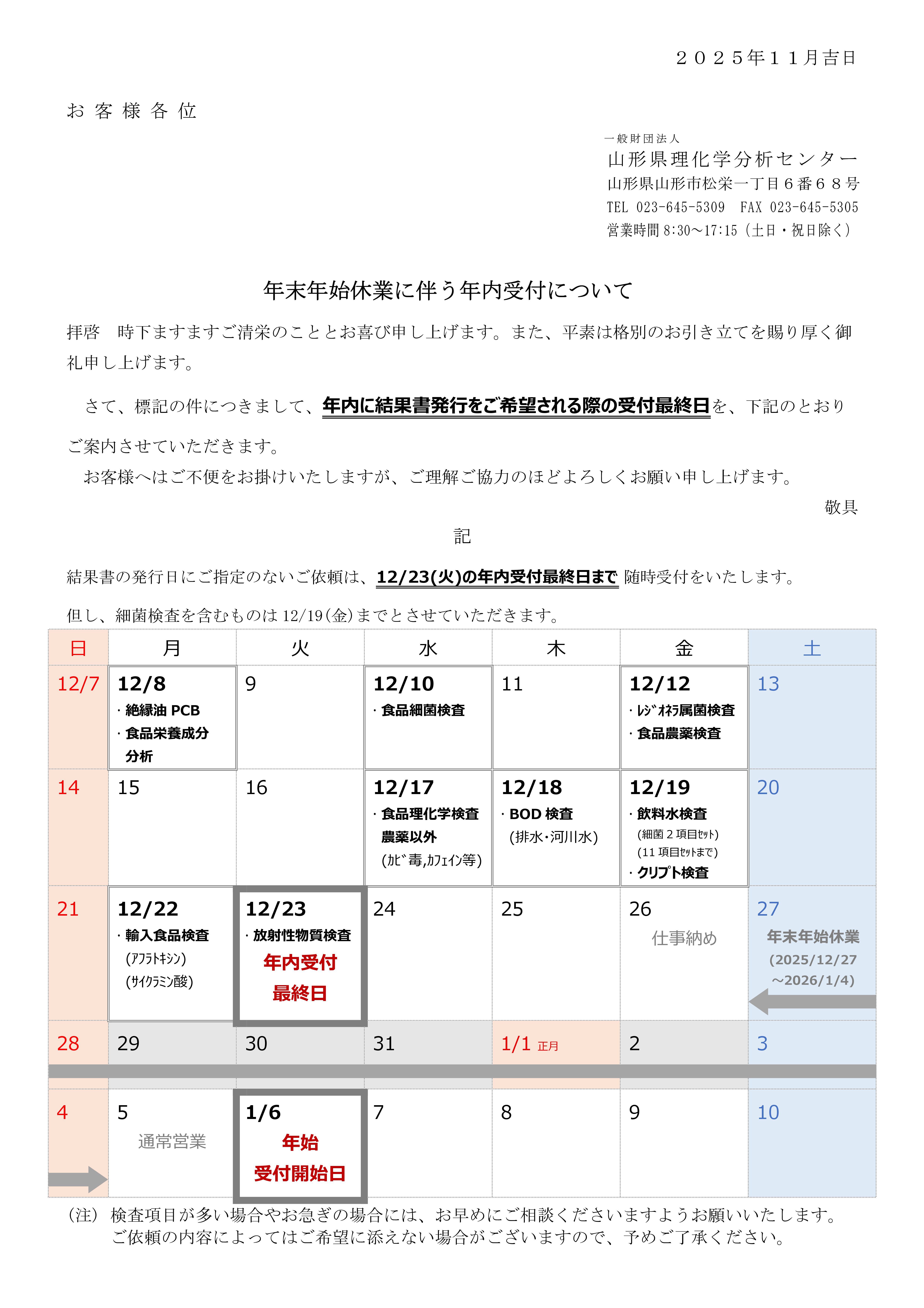 年末年始休業に伴う検査受付につきまして、次のとおりご案内させていただきますので、ご確認くださいますようよろしくお願い申しあげます。