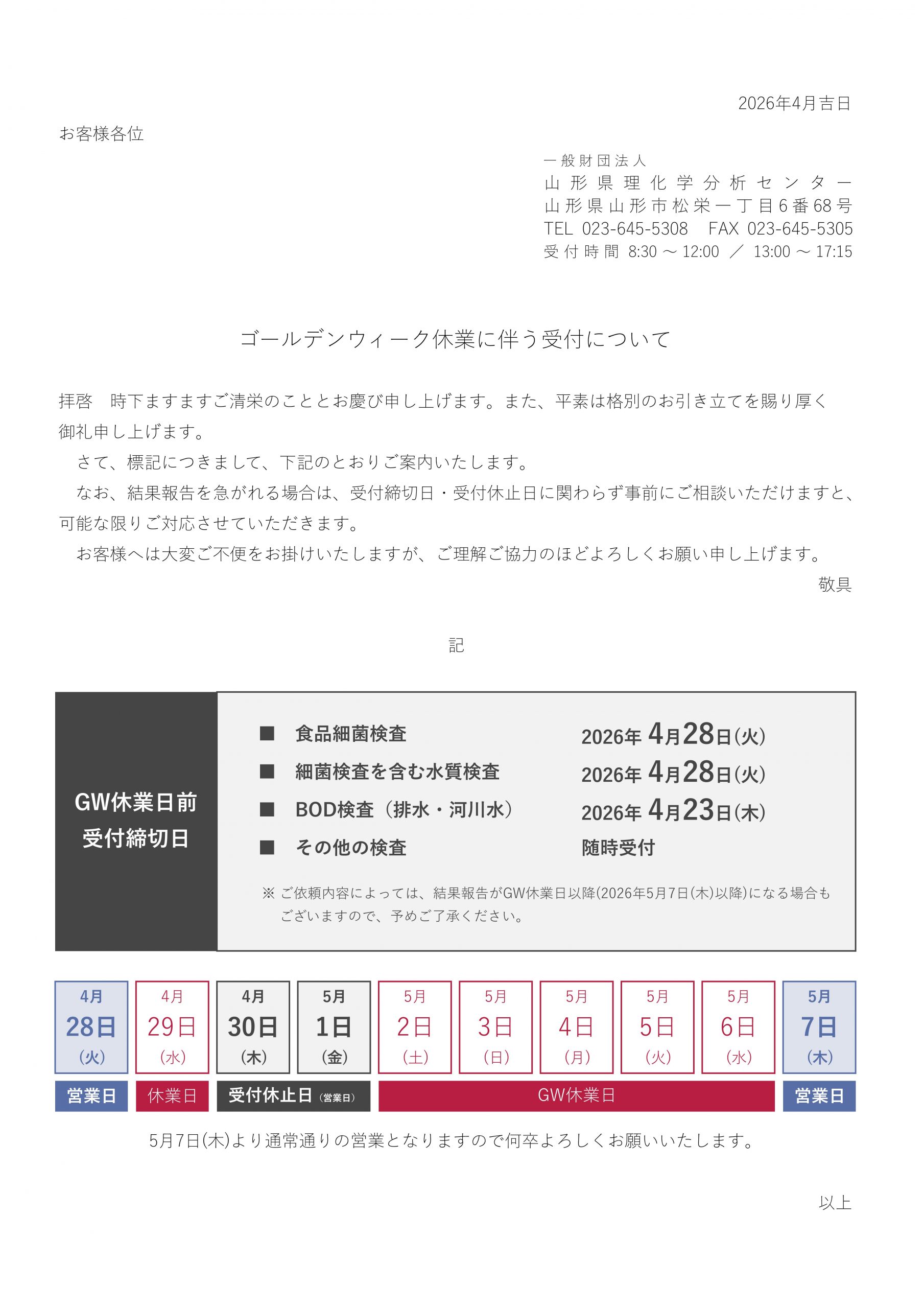 投稿者: y-rikagaku on お知らせ ゴールデンウイーク休業に伴う受付について 2026年04月01日 営業時間 山形県山形市松栄一丁目6番68号TEL 023-645-5308 / FAX 023-645-5305営業時間 平日 8:30~17:15(祝日除く) ・ 土日 休業